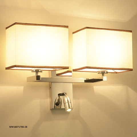 Customization Bedside 2 Lights Stainless Steel Wall Lamp with Square Fabric Shade Reading with USB Charger for Hotel Rooms